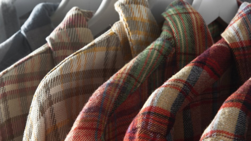 Старые разноцветные фланелевые рубашки в клетку на вешалках