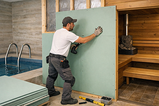 - Бассейны и сауны. Там, где влажность воздуха достигает 80–100%, альтернатив практически нет. Цементная основа аквапанели игнорирует прямое попадание воды и постоянный пар.