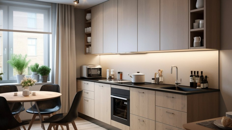 Дополнить общую палитру и придать интерьеру глубины и многослойности помогут фасады из тонированного белого дуба. Также можно заменить обычные металлические ручки на встроенные деревянные, а фартук выполнить из матовой плитки земляных оттенков. Столешницу рекомендуется подобрать выразительную, но нейтрального цвета. Переливы коричневого, серого и кремового идеально дополнят шкафы в бежево-землистых тонах.