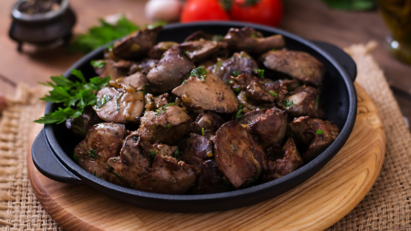 На черной тарелке-жаровне лежат кусочки пожаренной и посыпанной рубленой петрушкой печени, которая при правильном приготовлении получается нежной, сочной и без горького послевкусия