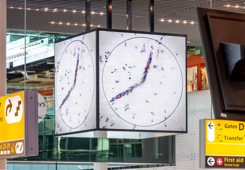 Для создания часов The People’s Clock, установленных в зале ожидания аэропорта Схипхол, нидерландский дизайнер привлек 1000 добровольцев. Участники перформанса синхронно перемещаются, имитируя движение часовой и минутной стрелок. Роль секундной стрелки выполняет один человек, который каждую минуту делает круг по периметру. Съемки проходили в ангаре аэропорта, а большинство волонтеров составили местные работники, в том числе сотрудники службы безопасности и обработки багажа, представители авиакомпаний и уборщики. Камера, установленная сверху, фиксировала перемещения участников в течение 12 часов. Итоговый результат отображается на четырех экранах, расположенных вокруг куба размером 250 × 250 × 250 сантиметров, что позволяет в игровой форме визуализировать время для десятков миллионов путешественников, проходящих через Схипхол ежегодно.