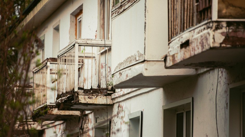 Дом с ветшающим фасадом и балконами из старого жилфонда России, где стремительно стареет рынок вторичного жилья
