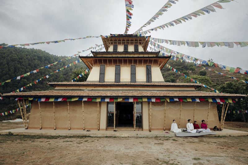 Аналогичным образом, в том же центре находится обеденный зал, построенный из изогнутого бамбука, а стены выложены глиной. Кажется, что изогнутый бамбук обволакивает медитирующих, защищая их от суровой горной погоды и рельефа региона. Стены помещения утеплены овечьей шерстью и оштукатурены землёй, что создаёт целебное убежище для медитирующих, которые проводят дни в этой уединенной горной местности.